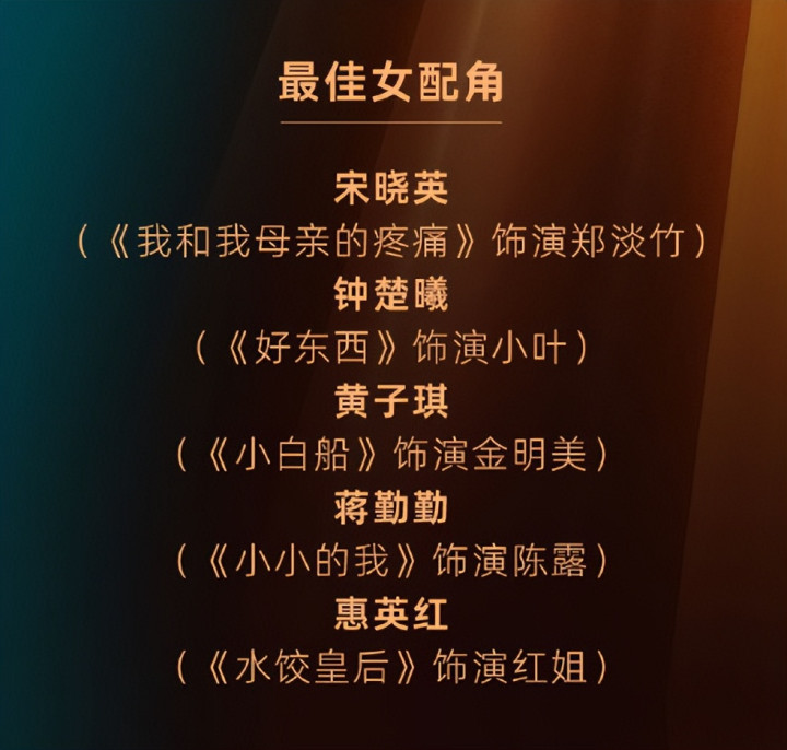 当然,相信很多观众更期待四个演技奖的评选,分别是影帝、影后、最佳男配和最佳女配。