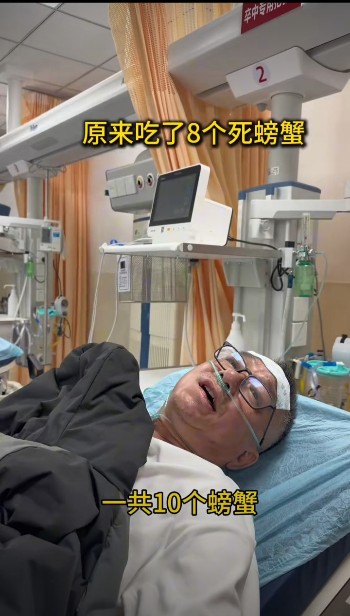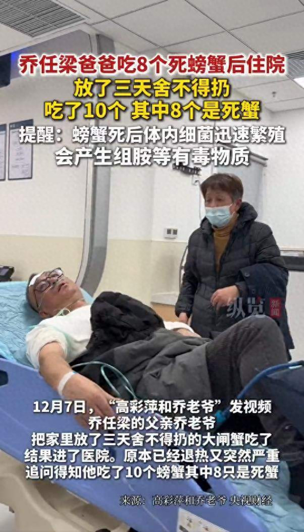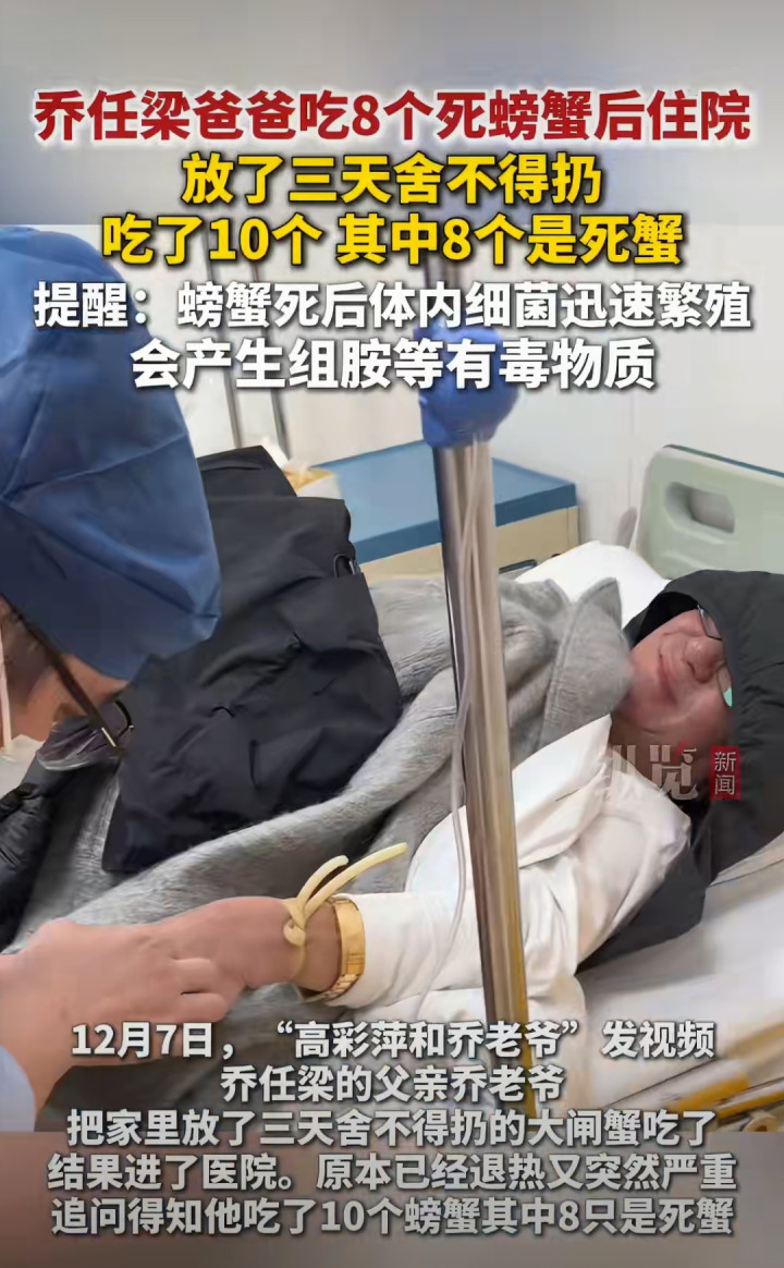 乔任梁父亲因舍不得丢弃家中已存放三日的大闸蟹,食用后出现发烧等食物中毒症状,短暂退热后病情加重入院。经追问得知,他共食用10只螃蟹,其中8只为死蟹。