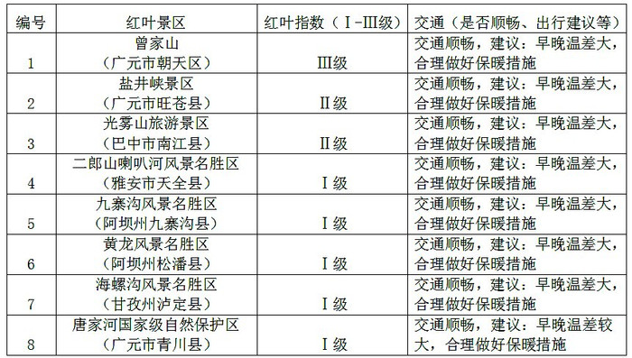 未来一周较适宜观赏红叶的景点,主要分布在我省东北部曾家山、盐井峡、光雾山景区。此外,今年受闰月和气候等因素影响,红叶观赏期较往年预计推迟10~15天。省林草旅游中心提醒,红叶宜晴朗天气观赏,大部分景区温差较大,需做好保暖措施,山路曲折,注意出行安全。